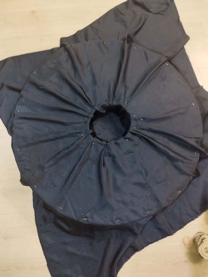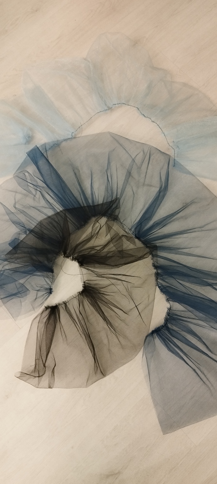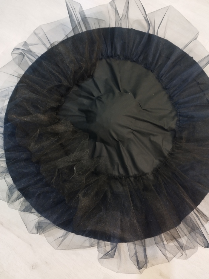 По всей окружности пришила бусины-капли на леске и при дефиле по комнате стало ясно, что дождинки нещадно путаются между собой. Поэтому была пришита вуаль из фатина и дождинки пришиты уже к ней.