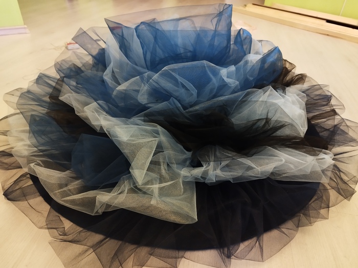 Картон, малярный скотч, фатин, бусины. Общая стоимость 4 к. + винишко, временные затраты - 3 недели по вечерам.