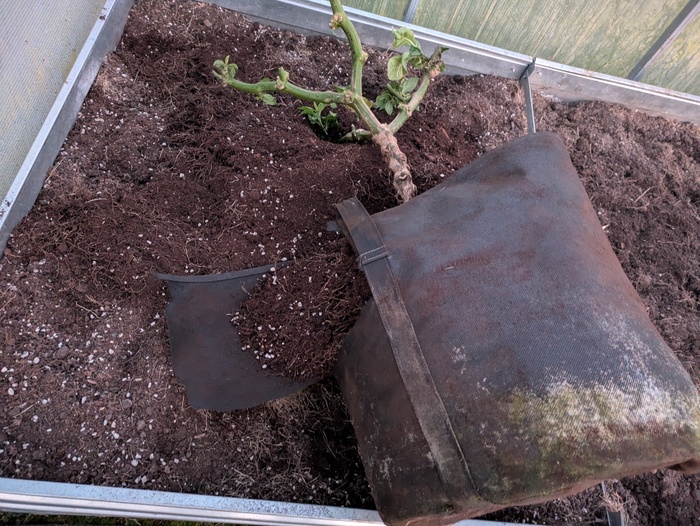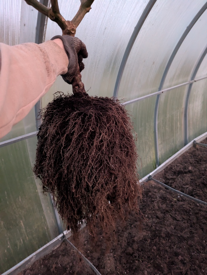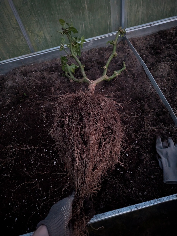 Коряга всё ещё не сдохла, хоть и продолжает подвергаться всяческим мучениям. Живёт она на балконе, где ночная температура составляет в среднем 5-7, а дневная 10-15 градусов со знаком плюс. Если в текущем состоянии куста дать ему тепла и света, то вегетативная масса захочет расти, но обрезанные корни не смогут обеспечить подачу воды и питания наверх и, как следствие, коряга загнётся.