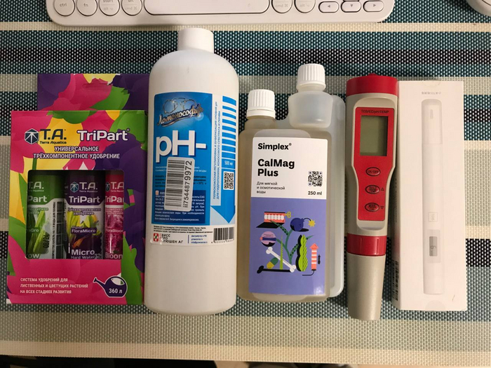 Продолжим дальше про оборудование и удобрения. На кокосе важно контролировать параметры рН и Ес (ppm) воды, т.к. кокос - это практически инертный субстрат, который не содержит в себе никакого питания. Всё питание в моём случае будет за счёт минеральных удобрений. На первый взгляд звучит сложно, но производитель удобрений даёт рекомендации по всем показателям в своих таблицах кормления. Теорию я изучил вроде бы как следует, а на практике посмотрим - самому интересно. Но уверен, что без подводных камней не обойдусь.