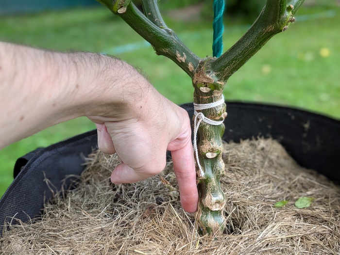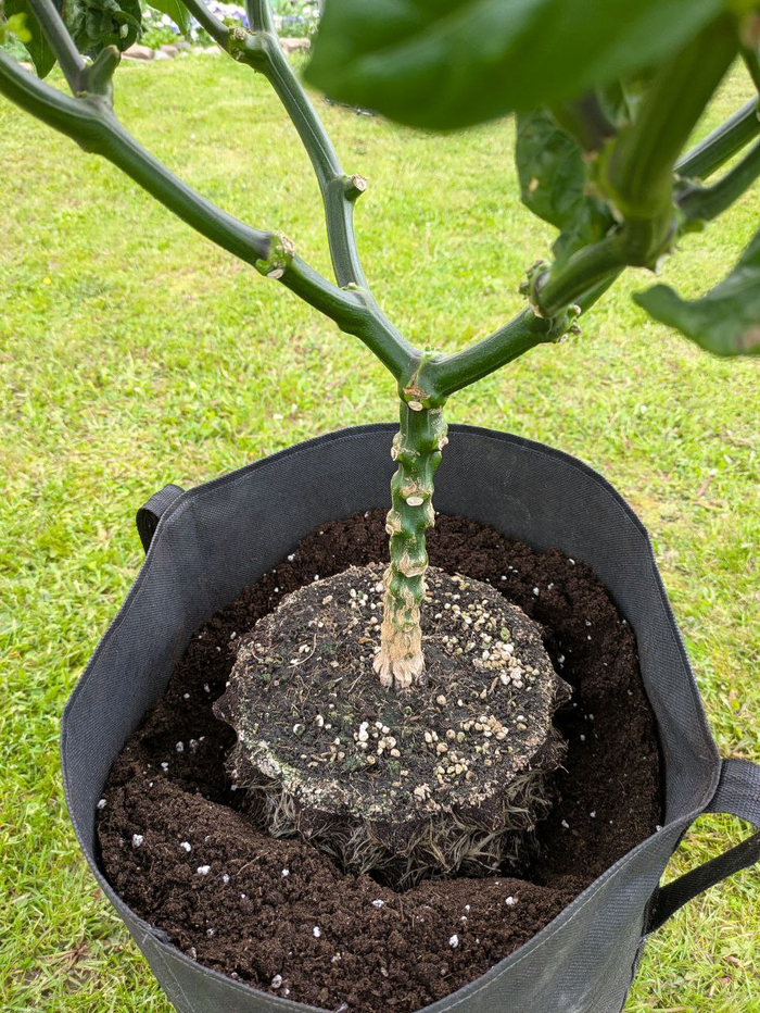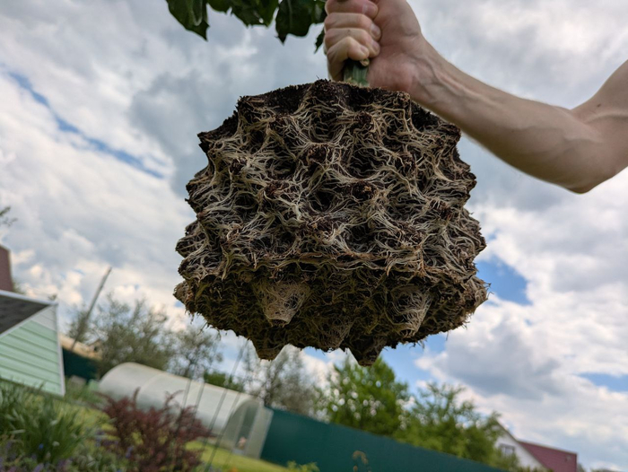 Напомню, что она была позабыта-позаброшена под некислым таким градом, когда гуляла вне теплицы и это довольно сильно сказалось на её благополучии. Ну а после установилась адовая жара, что позволило её поливать с подкормками гораздо чаще. С дрянной погодой первой половины лета горшок просыхал обычно 1.5-2 недели т.к. было холодно, пасмурно да и сама она есть особо не хотела.