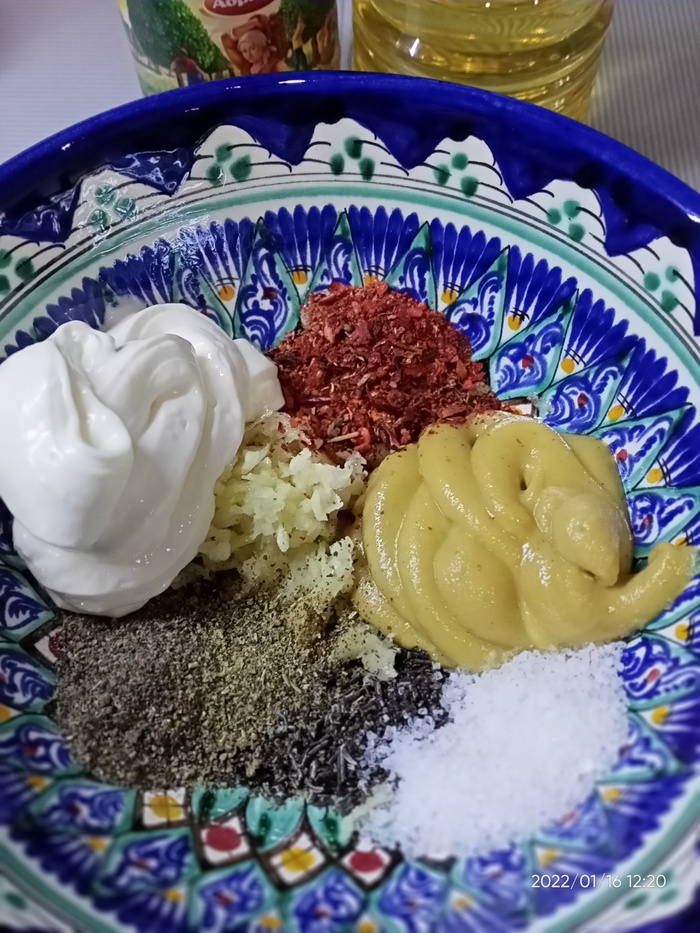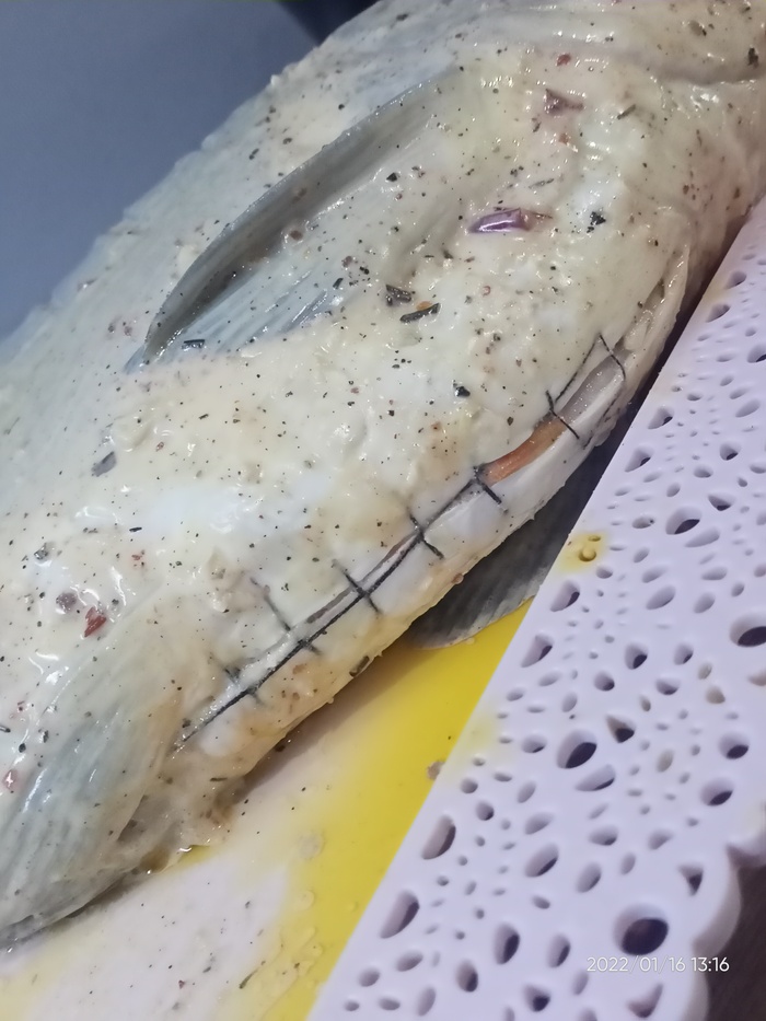 Обмазку вмазал в прорези на тушке и сверху немного размазал. И, конечно, внутрь карпу тоже обмазки досталось. А потом еще и зелень плотно уложил внутрь тушки.