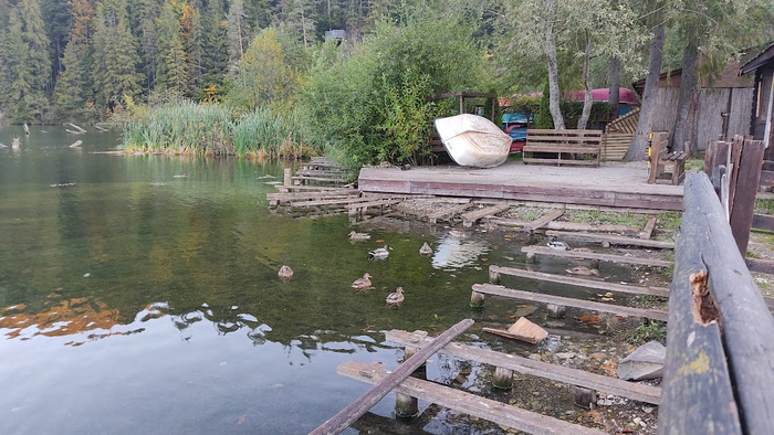 А с чего вообще решили, что оно красное? Почему оно называется Lacu Roșu (что в буквальном переводе с румынского и означает "Красное озеро")? Тому есть два объяснения. И первое чисто научное: полагают что один из ручьев, впадающих в это озеро приносит в него много окиси железа, которое вымывается из окружающих скал. Но что-то я этого особо не заметил. Может прошедшие не так давно в этом регионе проливные дожди смыли в озеро много грязи и оно временно помутнело?