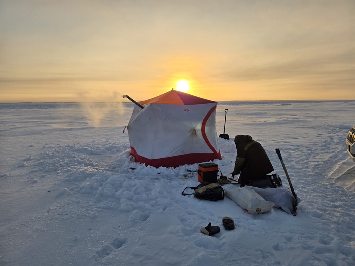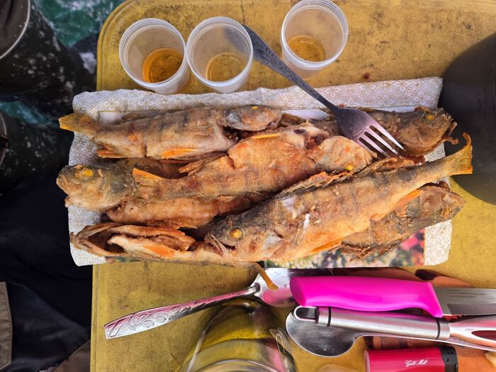 А в палатке хорошо. Чай вскипел, рыба жарится. А как без этого? Важное удовольствие на зимней рыбалке, слышать, как на сковородке шкворчит и ароматы вдыхать в предвкушении))