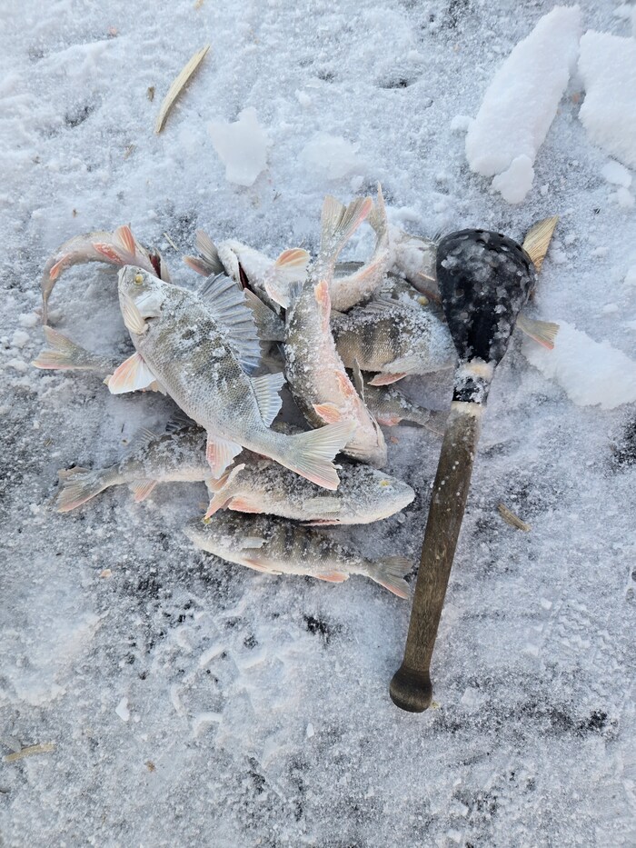 Всё понятно. Окунь ходит, надо искать. Благо, лед ещё не толстый, около 60 см. Поскольку массового выхода окуня не было, ловил на безмотылку, иногда подсаживая опарыша (вот такой я извращенец) с леской 0,1 мм. На улице больше часа не просидишь, но не в этом сложность. Поверхность лунки мгновенно схватывается и леска так же быстро обмерзает. Одна, максимум две проводки вверх и на опускании леска в лунку не уходит. Приходится лед с лески счищать, и из лунки ледок ложкой вычерпывать каждую минуту, если не чаще. А перфорация в ложке тоже льдом затягивается - стучишь по сапогу, чтобы очистить. В общем, за три выхода из палатки "в открытое пространство" пробурил я лунок 15. На стайку ни разу не нарвался, но с отдельных лунок по 5-7 полосатых разбойников подоставал.