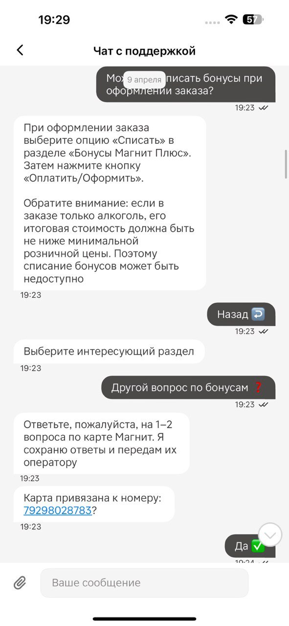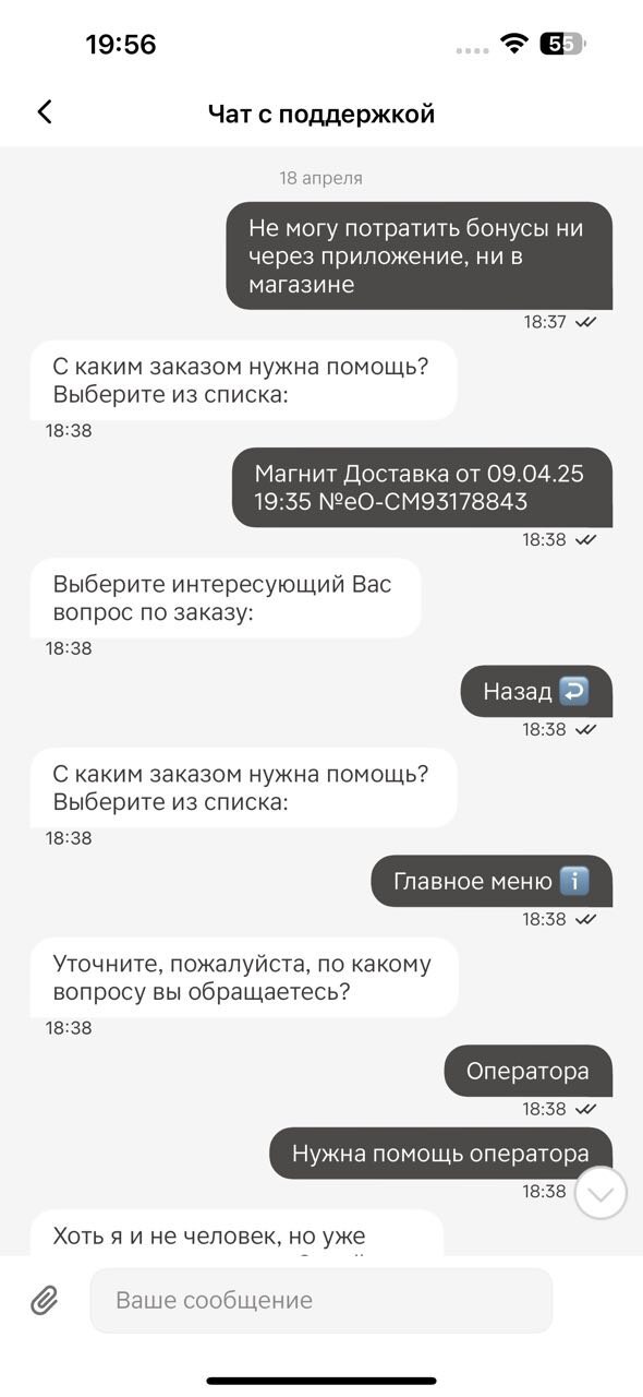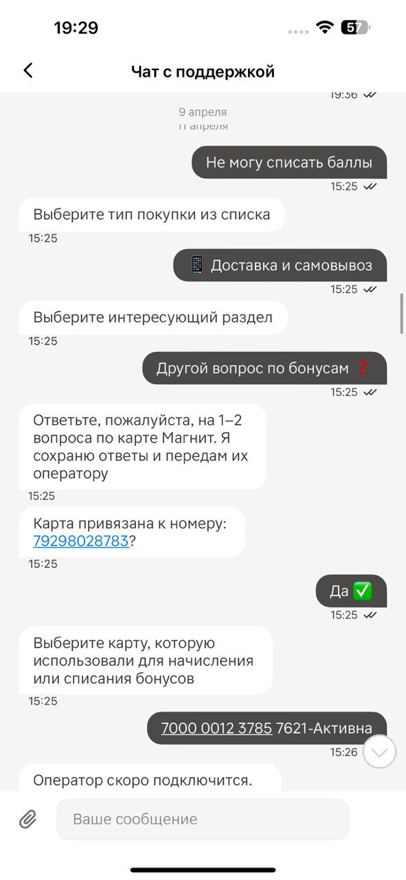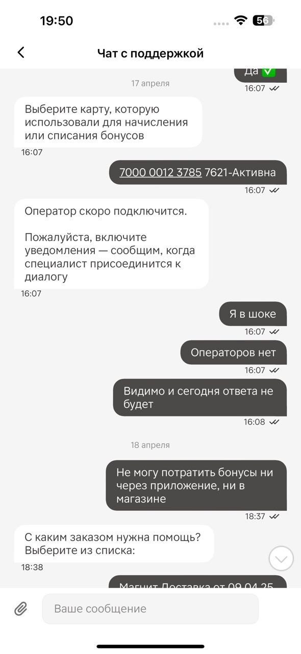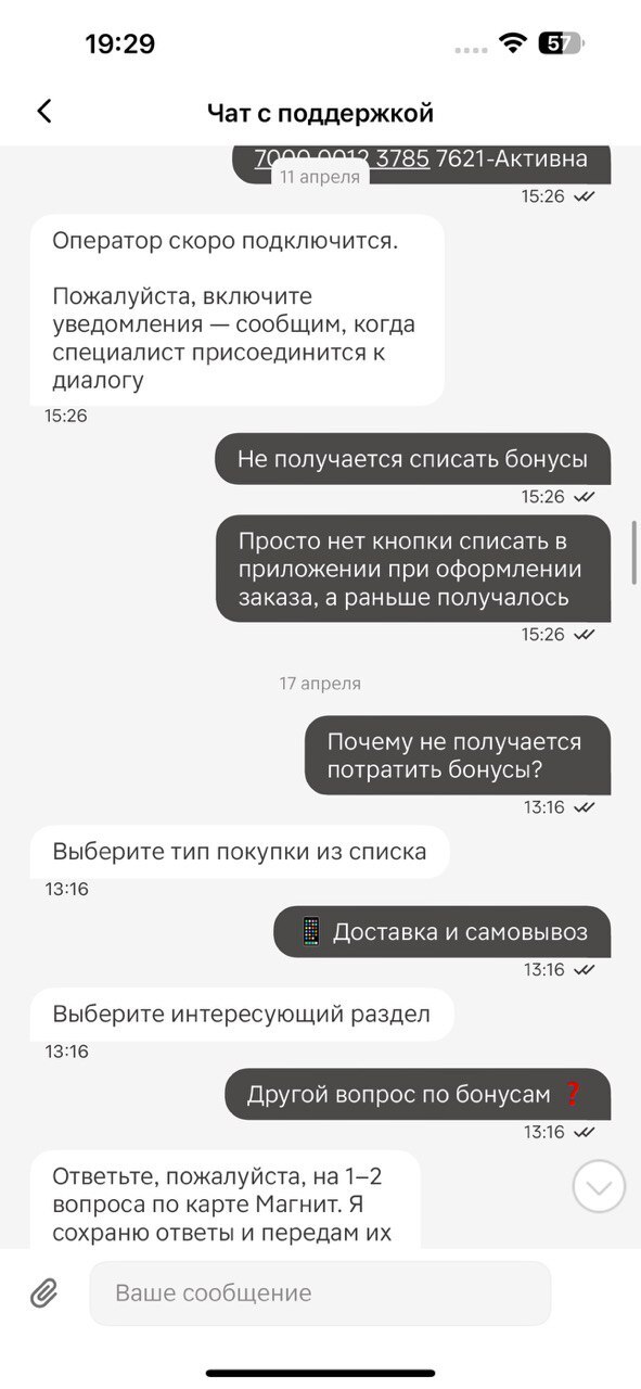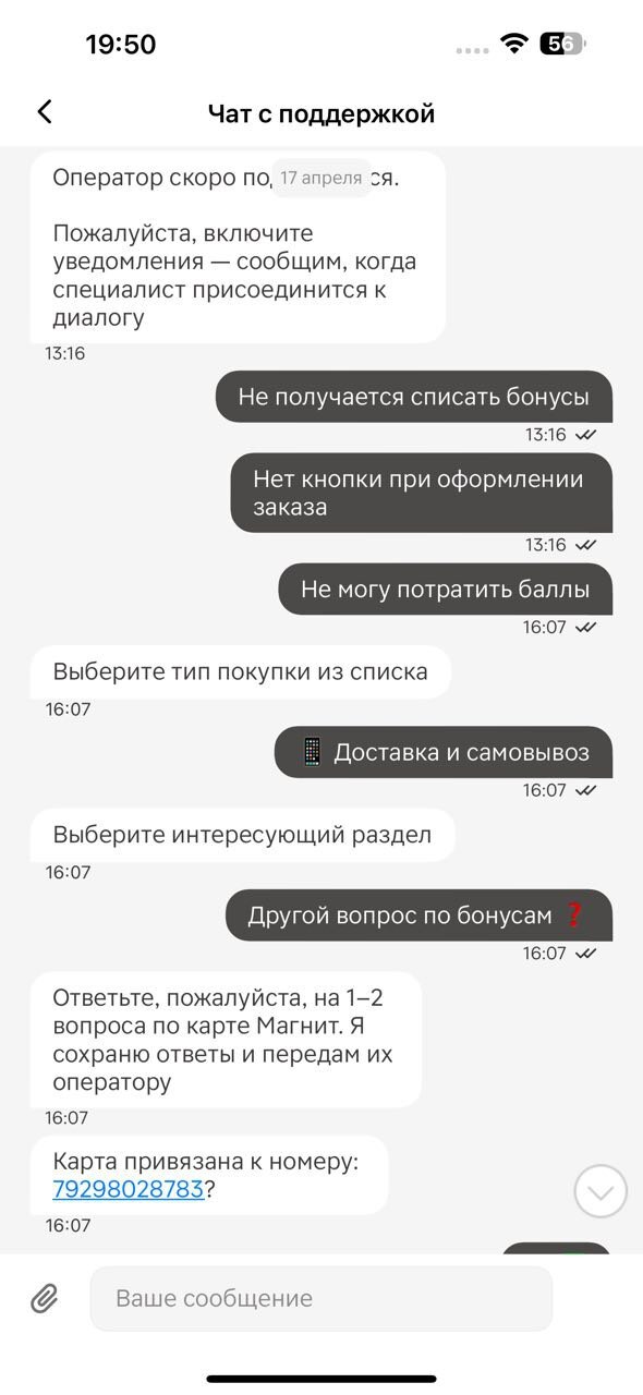 Наступило 9 апреля, я решил заказать продукты с доставкой и списать бонусы, но не увидел в приложении во время оформления фразы "Потратить бонусы", ее там попросту не было, хотя сколько начислено будет бонусов я увидел, поэтому не заподозрил ничего странного, а просто решил написать в поддержку, ведь она нам, всем клиентам Магнита, поможет?