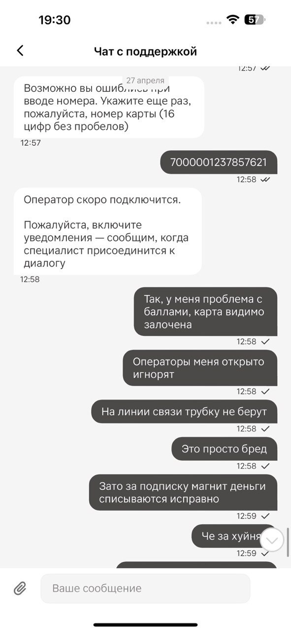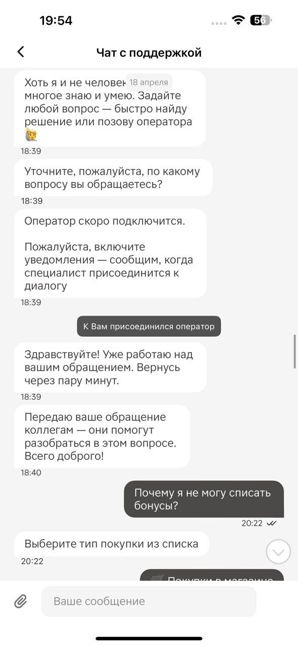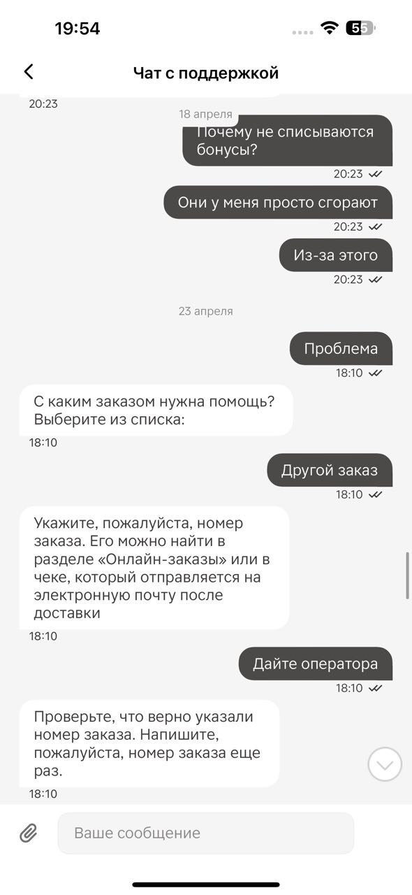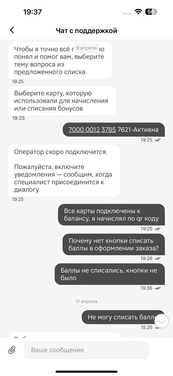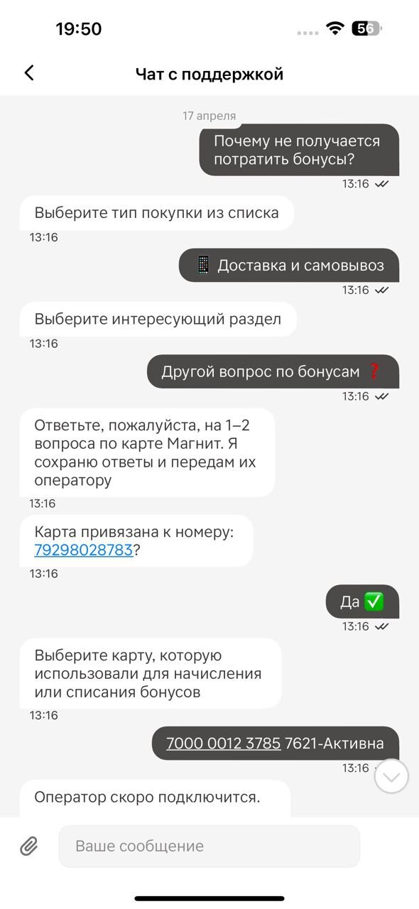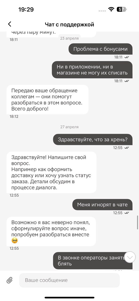 Наступило 9 апреля, я решил заказать продукты с доставкой и списать бонусы, но не увидел в приложении во время оформления фразы "Потратить бонусы", ее там попросту не было, хотя сколько начислено будет бонусов я увидел, поэтому не заподозрил ничего странного, а просто решил написать в поддержку, ведь она нам, всем клиентам Магнита, поможет?