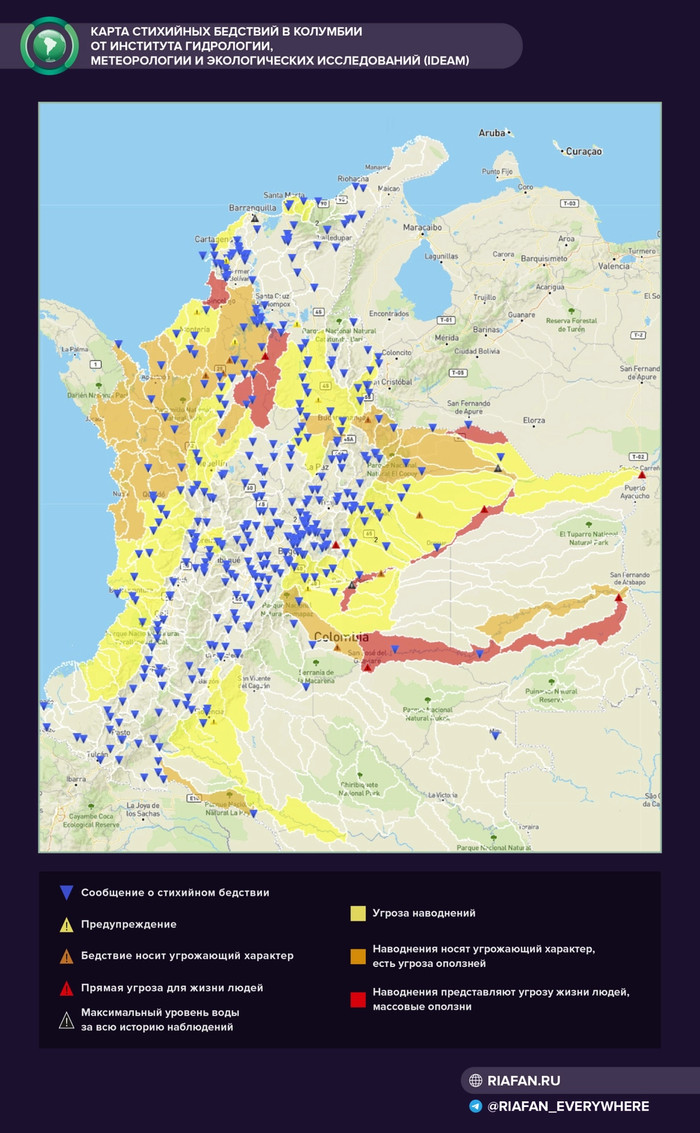 Некоторые из проблем, с которыми сейчас сталкиваются власти Колумбии, началась из-за начавшегося сезона дождей, на который большое влияние оказали усилившиеся в этом году тропические штормы. Но это, как обычно и бывает, было известно заранее.