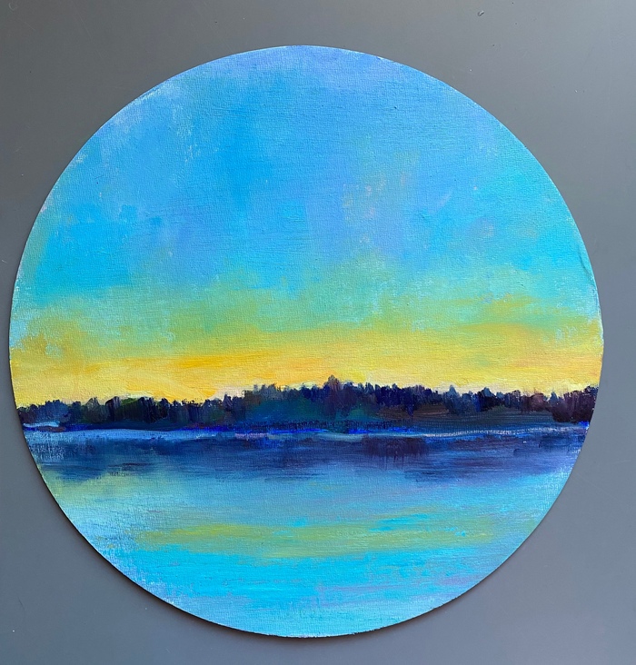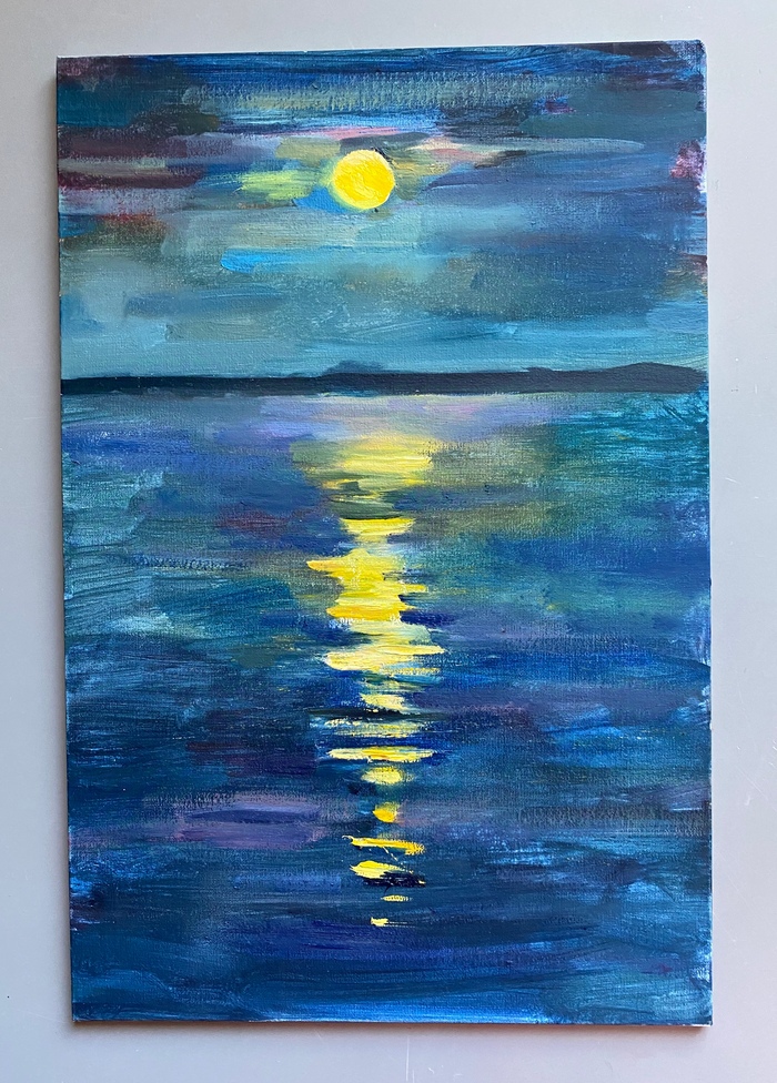 Работа "Лунный свет" была одной из первых, написанных в 2020 году. В то лето я жила в г.Тобольск, всю неделю в городе, а на выходные уезжала к своим на дачу, чтобы наесться сочных ягод и вдоволь пообниматься с сыном. Уезжая из Тюмени, я взяла с собой свой старый этюдник с четким намерением смахнуть с него пыль и хотя бы попробовать что-нибудь порисовать. Местные магазины не особо радуют художников своим ассортиментом, вилдберрис в помощь. К своему удивлению в одной из комнат на шкафу я нашла натянутый холст, забытый кем-то из многочисленных квартирантов, кому мы сдавали квартиру. Холст был самодельный, по краям сшитый на машинке, а вместо подрамника старая рама. На грунтованной поверхности был нарисован карандашный набросок-японка с цветущими саккурами. Но это не мой сюжет, поэтому перегрунтовав холст, я написала "Лунный свет" буквально за вечер. Цвета получились необыкновенно сочными, светящимися, и в тоже время прозрачными.