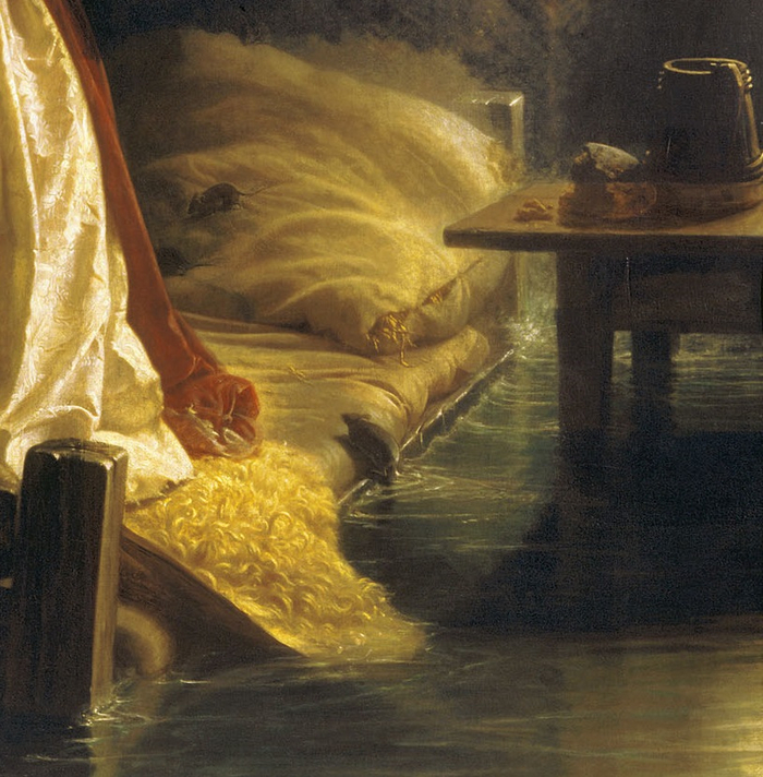 Кстати, самые внимательные заметят под столом собачку. Видимо, у нашего кавалера всё же есть и положительные черты, а именно любовь к животным: в одной комнате вместе с ним живут собака, кошка, канарейка. Другие животные - тараканы - увы, также присутствуют - и прямо на тарелке с колбасой.