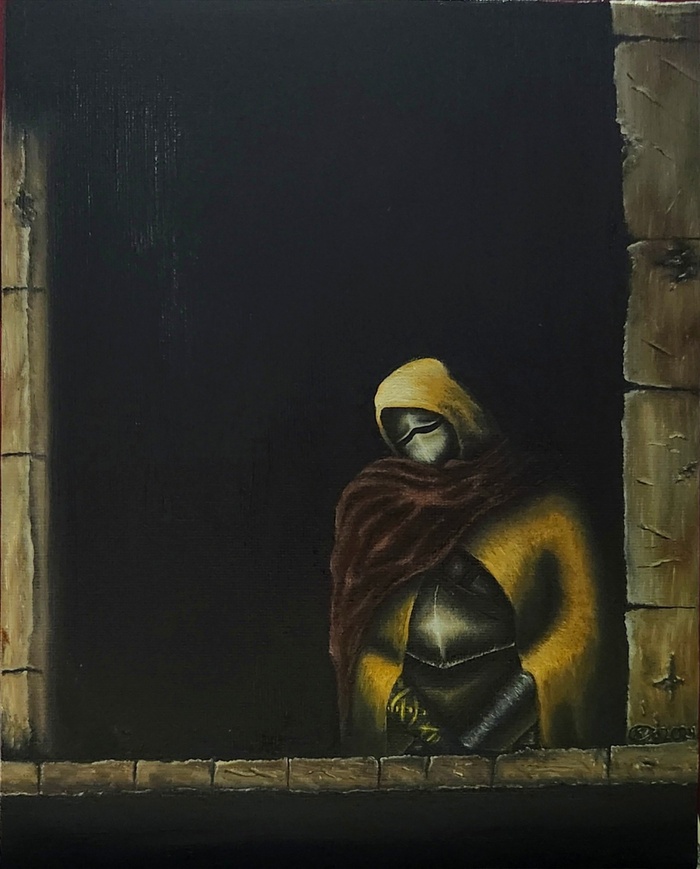 Сама идея смиренного и тоскливого рыцаря у меня возникла после прохождения игры "Dark Souls", в игре есть персонаж Соллер, это позитивный парень, который помогает игроку, хоть и ведёт себя немного странно. У Соллера есть цель- найти свое собственное Солнце, но в какой- то момент Соллера можно найти уставшим, разочарованным, толкующим депрессивные речи о том, что даже пройдя столь длинный путь своего Солнца он не нашёл.Я вдохнавился самим образом опечаленного лишеннного надежды рыцаря, ведь, казалось бы, обычно мы видим в различных произведениях рыцарей бравыми и доблестными войнами, но никак не разочарованными и уставшими. После того, как я вспомнил этот образ спустя много месяцев после прохождения, я загорелся тем, чтобы изобразить что- то схожее по настроению, но тут встали другие вопросы, какого рыцаря рисовать, и в какой обстановке. Свой выбор я остановил на доспехах падшего рыцаря из "Dark Souls 3", но сильно изменил, я бы сказал, что переработал вообще все, поменял цвета, убрал все связанное с оружием, сделал сами доспехи новыми на вид, и, что самое главное, массивный плащ и пончо я изобразил так, что рыцарь не сможет сражаться, просто потому что они сковывают движения, а снять их быстро не выйдет, так как сначала надо будет снять пончо, что в доспехах сделать уже непросто, а после и основной массив тряпья. Когда я писал этого рыцаря, я вдохновлялся иконописью, не какой- то конкретной работой, а скорее направлением в целом, мне нужно было сделать так, чтобы тоска и смирение были в самой сути моего рыцаря, к тому же из- за около иконописного стиля рыцарь выглядит ещё более обезаруженным. Таким образом, я и смог создать образ одинокого, тоскливого и уставшего рыцаря, а может и разочарованного. Сама идея с гигантским окном родилась не просто так, мне нужно было изобразить рыцаря максимально мелким на фоне огромного мира, отсюда и пришла идея с чёрным фоном и исполинским окном.