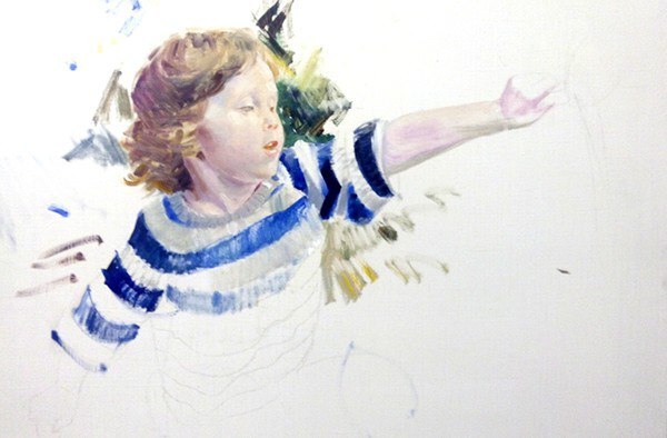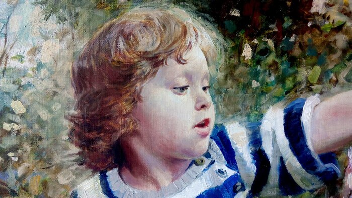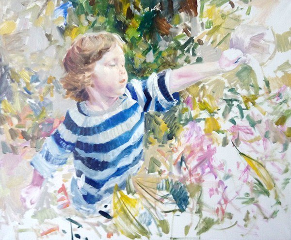 Получилось очень тёплое, летнее полотно. Мне хотелось передать радость, с которой она заботится о каждом растении, и ту красоту, которую она создаёт своими руками