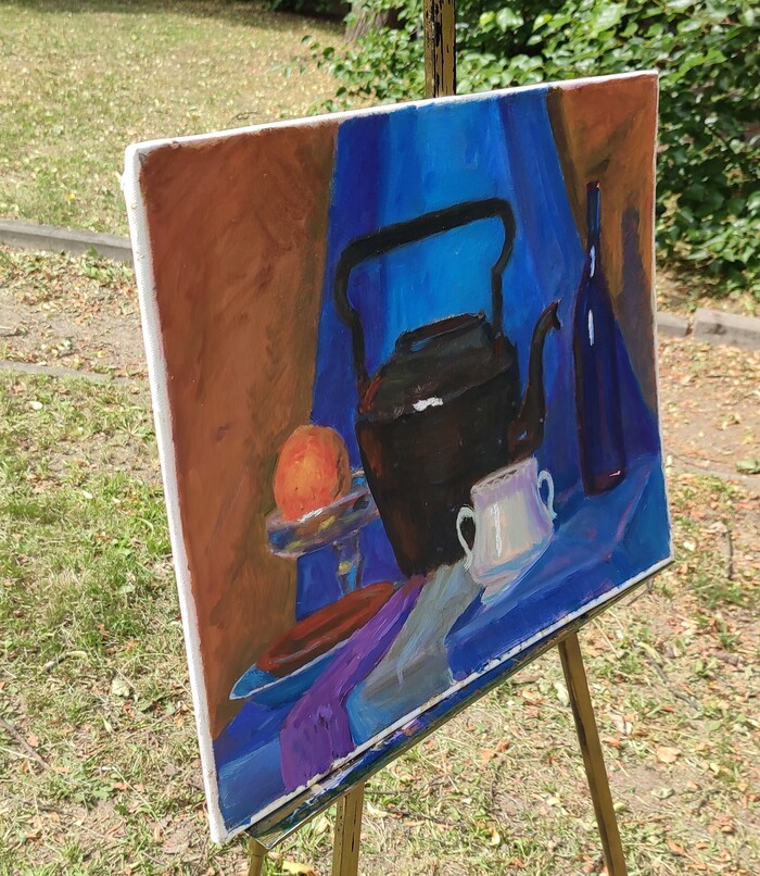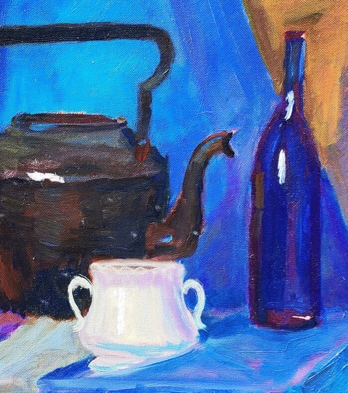 Эта история начинается в тот день, когда я решил создать картину, которая бы отражала мое внутреннее состояние и передавала бы моим зрителям чувство ожидания и предвкушения. Я начал работу над картиной с изображением черного чайника, белой керамической сахарницы и других предметов.