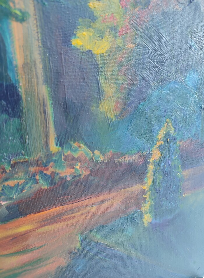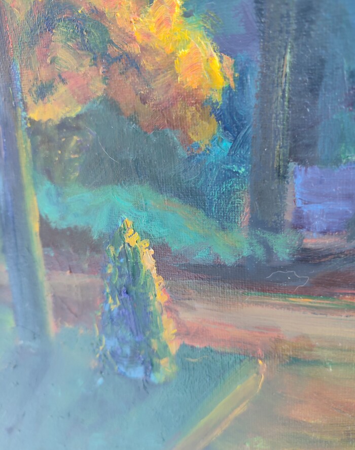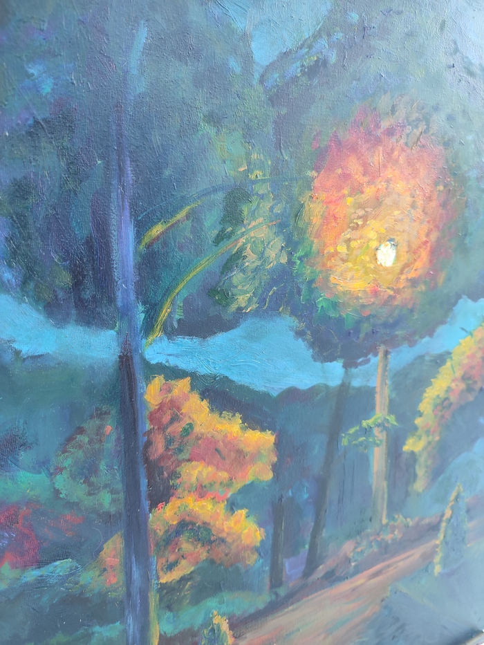 Мое внимание привлек одиноко стоящий фонарь на углу улицы, который был слегка прикрыт деревьями. Его свет проскакивал сквозь листья, образуя маленькие золотые пятна на асфальте. Это было так красиво и необычно, что мне сразу захотелось запечатлеть этот момент на холсте.