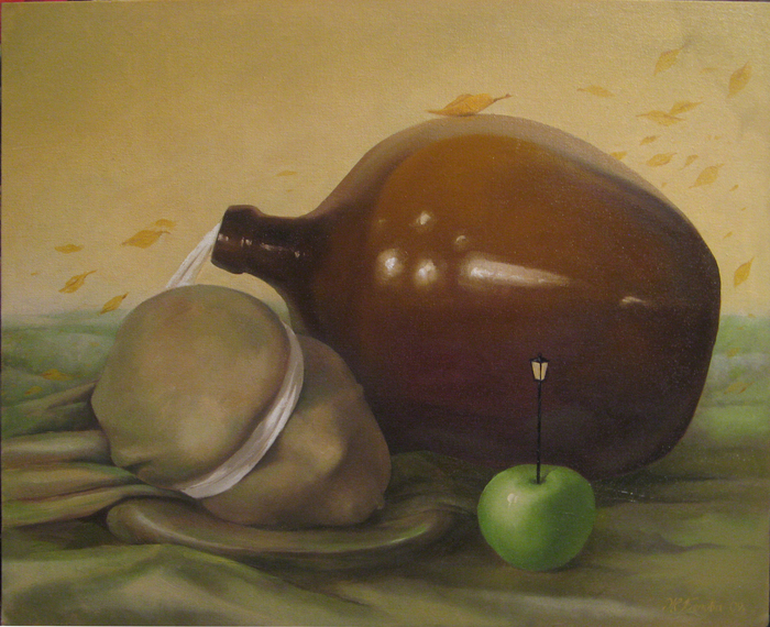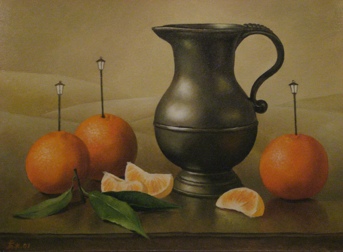 Александр Александрович, изображенный на нем, - тоже участник выставки. А вот мастерски выполненные батики Л. Артюковой "Осень в Павловске", "Рождество". Живопись в духе авангарда представил ивангородец