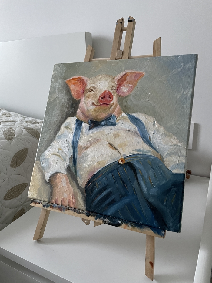 Картина с милой хрюшей по имени Фрося излучает теплоту и радость. Она стоит среди луговых цветов, словно сама природа поздравляет её с новым днем. На её голове — очаровательный веночек, который подчеркивает её юность и невинность. Нежное голубое небо с розовыми облаками создает атмосферу лёгкости и счастья, наполняя пространство светом и теплом.