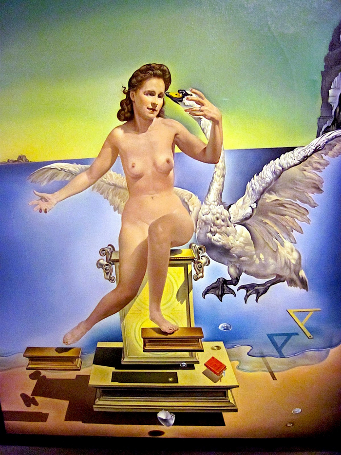 Ниже та самая картина Дали «Атомная Леда». Дали начал работу над своим холстом в 1945 году, вскоре после атомной бомбардировки Хиросимы. Картина вместила в себя известный с XVI века иконографический сюжет, изображающий Леду, легендарную правительницу Спарты, в процессе совокупления с принявшим форму лебедя Зевсом.