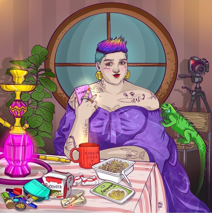 Второй темой стало самовыражение. В то время я только переехала из небольшой деревни Якутии в прекрасный Питер и с интересом смотрела на людей с цветными волосами, узорами в виде тату по всему телу, на смелые и порой немного странные сочетания цветов в одежде. На самом деле в тот период я рисовала много портретов, настолько вдохновляли меня яркие петербуржцы.