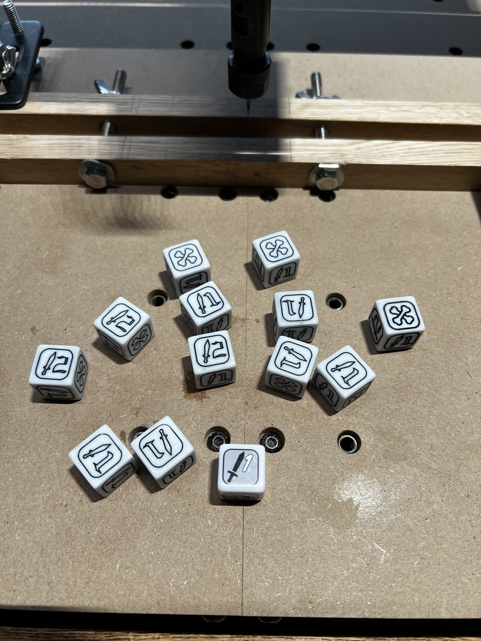 Ну а я тем временем немного разобрался в Арткаме (прога для дизайна моделей под него) и фрезанул себе кубики новые для настольной игры, родные стерлись очень быстро, и было грустно - возможно, именно это и послужило стимулом для всей этой эпопеи, которая с покупками с Алика, всеми этими переделками-перезаказами длилась с конца июля по сейчас.