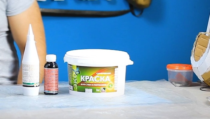 Покрасить хотелось максимально бюджетно, так что была куплена самая дешёвая водоэмульсионка для стен и потолков. Первым слоем прогрунтовал картон, добавив в краску чёрный колер и клей ПВА для лучшей адгезии(процентов 10 от объёма краски).