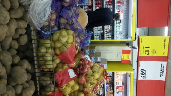 В магазине картофель уложен так, чтобы казалось, что это мытый фасованный картофель стоит 11,95 руб:
