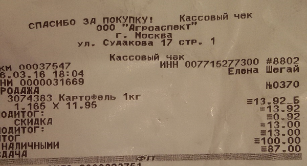 Купил в Пятёрочке 1,165 кг картофеля по 11.95 руб за килограмм: