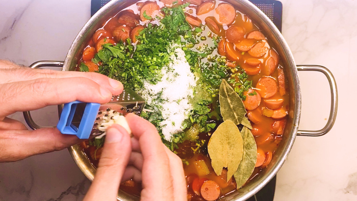 Приправляем солью, сахаром, перцем, лавровым листом, натертый чеснок