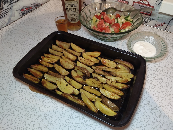 Решил приготовить ужин из того, что было в холодильнике. Была открытая бутылка коньяка, котлетки, овощи и я решил, что хорошую компанию им составит картошка, приготовленная в духовке.