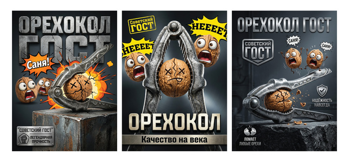 Описание сцены: внутри орехокола лежит атпропоморфный грецкий орех, у него вместо глаз – кресты, он не жилец, его скорлупа уже расколота. На заднем плане стоят 2 антропоморфных грецких ореха с огромными от страха глазами и кричат... Саня/Нееет...!
