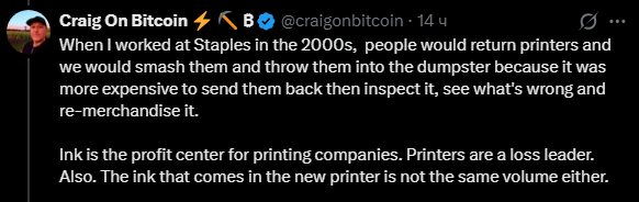 Когда я работал в Staples в 2000-х годах, люди возвращали принтеры, а мы их разбивали и выбрасывали в мусорный контейнер, потому что было дороже отправить их обратно, а затем осмотреть, выяснить, что не так, и продать заново. Чернила — источник прибыли. Принтеры — убыточные для компании. Кроме того, объём чернил, поступающих с новым принтером меньше.