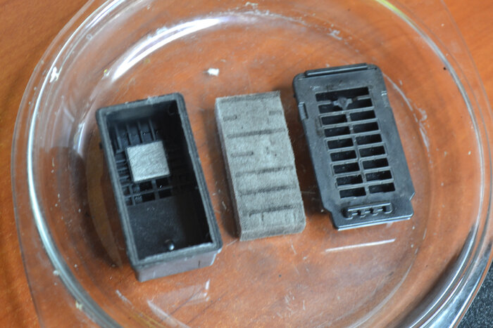 Следующим моим решением было то, что я хотела разобрать картридж совсем и посмотреть, что же там творится внутри. И вот вскрытие самого картриджа было самое трудное, во всяком случае для меня. И когда я вскрыла его, то была очень удивлена, что чернила оставшиеся в нем были по консистенции как какой-то жидкий кисель. Хотя я знаю, что чернила для струйных принтеров очень гигроскопичные и проникают везде. А это.... ? Вытащив губку из корпуса я отправилась в ванную, что бы это все промыть, прихватив еще мягенькую кисточку для рисования, потому что внутри нужно все хорошенько аккуратно отмыть теплой водой, без применения моющих средств. Когда я все отмыла, стало выглядеть так:-