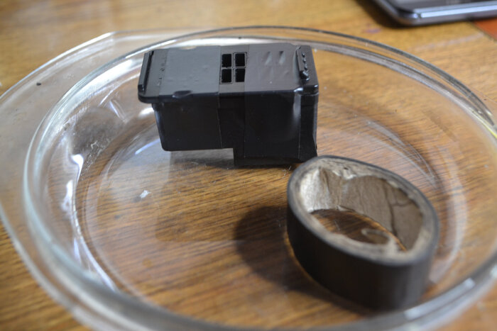 Теперь осталось картридж вновь собрать, заправить и вставить в принтер и сделать контрольную печать чего нибудь. И вот здесь я столкнулась с некоторым моментом. Когда я стала закрывать картридж, то верхняя крышка на него уже плотно не садилась. И я тогда подумала:- ну да ладно, можно ее посадить на горячий клей и все. И нет проблем. А потом вдруг:- НЕТ! Этого делать нельзя. Почему? Потому что а вдруг мне придется когда-нибудь снова таким способом восстанавливать этот картридж, и как я его буду открывать, если его крышка будет приклеена? Нет! Это не вариант. И я нашла другой способ. Скотч я дома не нашла, наверное его утащил Васян, когда игрался, этот прохиндей все таскает и где нибудь прячет, что находится потом случайно. Вообщем скотча нет, но есть черная изолента. И я просто эту крышку закрепила плотно изолентой, оставив только малюсенькую дырочку в ней, для заправки картриджа, которую потом в последствии тоже заклеила. И стал у меня картридж выглядеть так:-