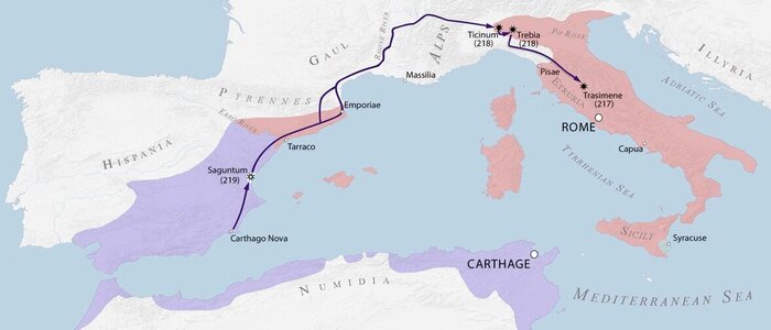Ганнибалу пришлось пересечь Альпы, потому что он не мог перебросить свои войска в Италию морем, у него не было достаточного количества портов союзников для поддержки такого рода морских экспедиций