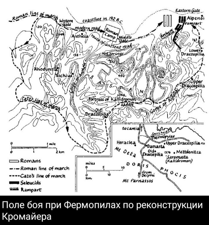 Царь проигнорировал речи и советы карфагенского полководца и в 191 году до н. э. вторгся на территорию Греции. Битва между римлянами и сирийцами произошла в Фермопильском ущелье (24 апреля 191 г. до н. э.), где ранее совершили подвиг спартанцы с союзными войсками греков. История нового сражения была такой же, как и старого. Военный трибун Марк Порций Катон (Старший) возглавил отряд из 200 легионеров и повёл их ночью по той самой обходной дороге, где когда-то персы обошли греков. Римлянам удалось заставить вернуться Антиоха в Малую Азию и начать борьбу за проливы и выходы к морю. Через год (сентябрь 190 г. до н. э.) также состоялось сражение у мыса Мионесс (недалеко от острова Хиос). У римлян было 58 военных кораблей и 22 со стороны родосцев, у сирийцев - 89 военных судов. Победу одержали римляне благодаря отважным родосцам с оружием, установленным на носу корабля и способным поджигать вражеские суда (прототип греческого огня византийцев).