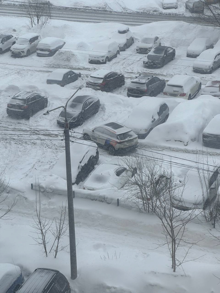 ну и просто красивый вид с верху, показывающий масштаб красоты. Машина в снегу, которую перекрыл карш наглухо ( в среднем ряду) стала снеговиком поневоле, так как водитель не смог выехать.