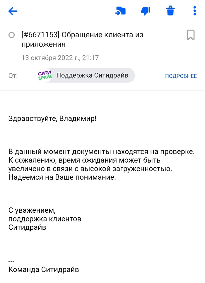 Ответ подери Ситидрайва после 2х недель ожидания отмены выставленного штрафа