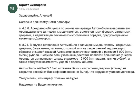Я знаю как себя ведут конкуренты Ситидрайва в подобных ситуациях. Край того что они могут сделать — отказаться компенсировать простой. Ну откажут и откажут (хотя кроме Ситидрайва никто не отказывал), но в догонку выставлять штраф — за гранью моего понимания.