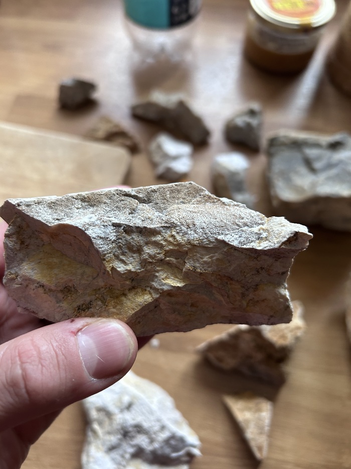 Здесь, среди осадочных пород, которые разваливаются сами по себе, можно найти много интересного. Фоткать не стал, потому что очень грязно, и весь перемазался, но делюсь парочкой экземпляров.