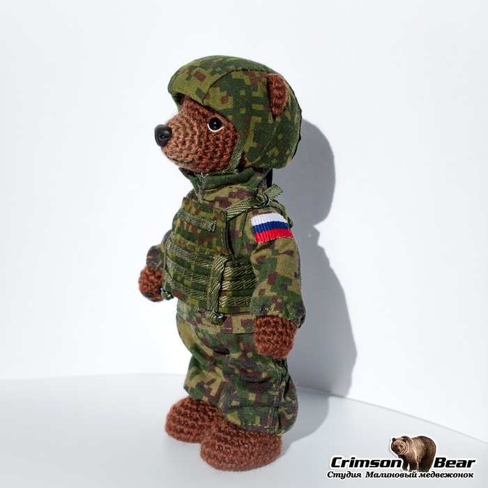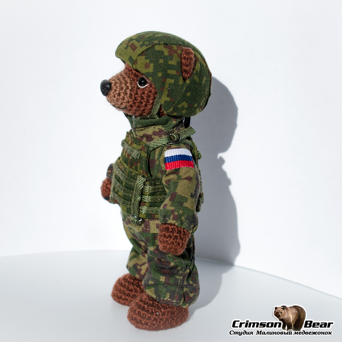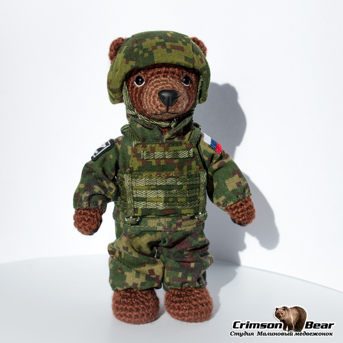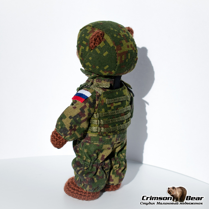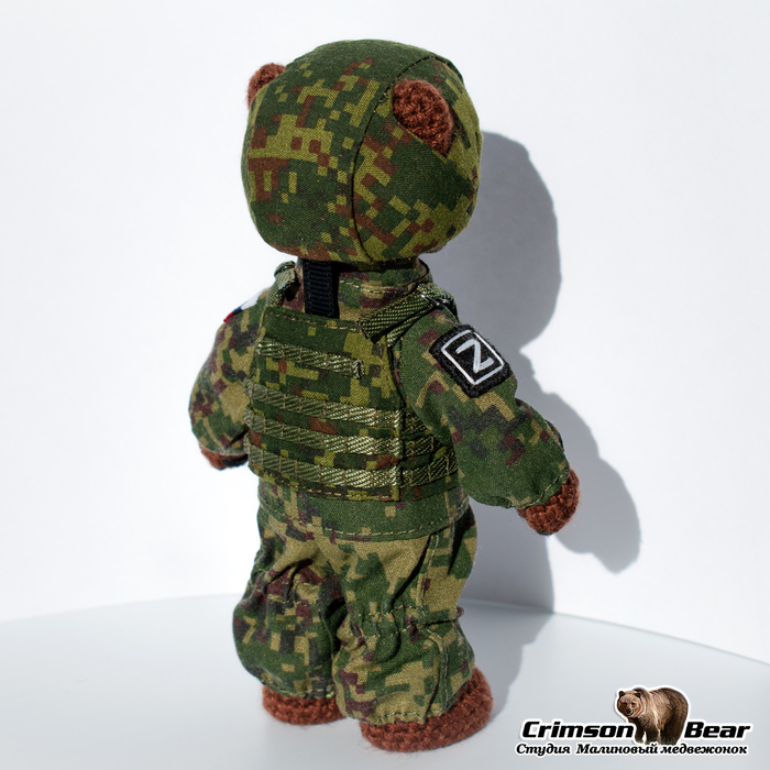 Размер медведя 14 см. Подвижная голова на шплинтовом креплении, лапы на меднопроволочном каркасе. Камуфляжный бронежилет. Каска из композита, сверху камуфляжный чехол. Нашивки флаг РФ и Z.