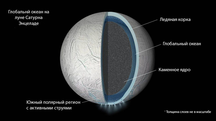 В разрезе показано внутреннее строение Энцелада, спутника Сатурна.