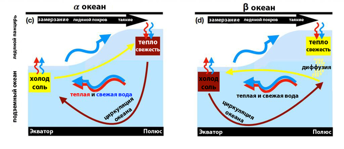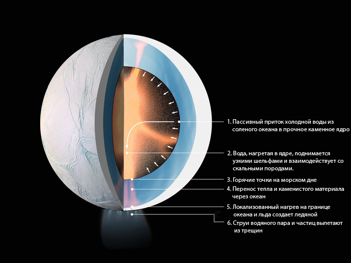 На Энцеладе есть два места для потенциального источника тепла: в силикатном ядре или в нижнем шельфовом леднике, где он встречается с верхней частью океана. Если в силикатном ядре вырабатывается значительное количество тепла из-за приливных изгибов под океаном, ученые ожидают увидеть конвекцию, точно такую же, как при кипячении воды в горшке. Точно так же, если замерзание происходит на поверхности океана, соль будет вытеснена изо льда, увеличивая локальную плотность воды и вызывая конвекцию сверху.