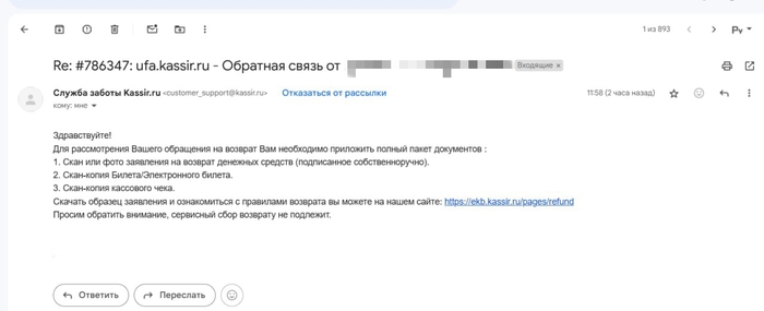 Хотел было сходить на балет и решил воспользоваться сервисом кассир.ру, но по определённым причинам мне пришлось вернуть билет и вернуть денежные средства: и как же я офигел когда поддержка прислала мне данное сообщение, в котором содержится перечень нужных документов для возврата средств, это просто возвращение в 90-е 😂 возврат билетов усложнен максимально для неудобства потребителя(на скриншоте видно что нужно приложить) но это ещё не всё, затем мне прислали сообщение что могут вернуть только 50% стоимости и не могут вернуть сервисный сбор в размере 170р, то есть этот "чудесный" сервис по продаже билетов просто так захапал себе 1020 рублей, не оказав никакой услуги, даже вменяемый возврат средств не могут сделать а сервисный сбор берут, я потратил на возврат средств 1 час своего времени, мне пришлось ради этого даже скачать программу для редактирования pdf файлов, в итоге они могут вернуть лишь 850р вместо 1700, ссылаясь на закон что до 10 дней возвращается 100% стоимости, а после уже 50%, но я не мог ранее вернуть билет т.к. болел, учитывая какие манипуляции надо сделать чтоб вернуть билет😂 До начала мероприятия оставалось 9 дней, но служба поддержки "чудесного" сервиса решила мне отказать в этом, что ж, окей, свой выбор они сделали, я этим сервисом больше пользоваться не собираюсь и другим не советую.