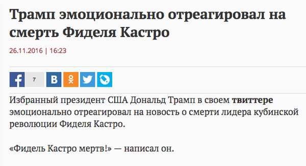 «Умер Фидель Кастро. Соболезную кубинским друзьям, всему народу Кубы. Кастро был из плеяды Великих, поменявших мир. Мир будет помнить о нем»,— написал в Twitter бывший глава комитета Госдумы по международным делам, российский сенатор Алексей Пушков.