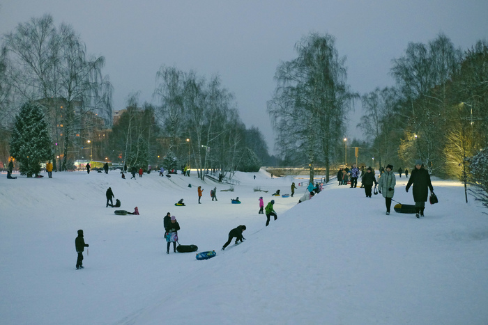 И вот , облачённый в самые тёплые одеяния я бегу на гору , где ребята уже вовсю катались , а катались они не просто на куске линолеума , а на обрезанном пластиковом еврокубе.