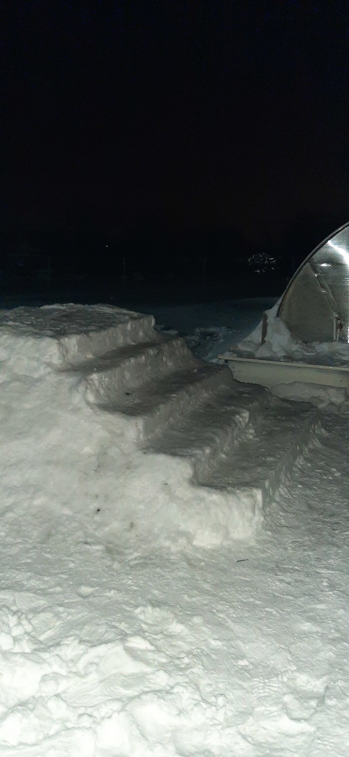 Я думала горку построить -- раз плюнуть. Строим уже несколько дней. Сначала снега мало выпало, но и то что было начали понемногу сгребать в одну кучу. Потом снегопад и еле успевали почистить двор,, потом оттепель и сверху образовалась корочка-- наст. Ждали снега, хотелось достроить и вот он посыпал. Ура! Таскали на одно место и вот-- визуально горка готова, даже ступеньки небольшие уже готовы. Но снег проваливался , даже после нескольких дней не осел и пришлось трамбовать. Потом заливали из лейки до корочки-- натаскались воды ого-го сколько, а наледи нет. Вчера подключили шланг и пролили сначала распылителем, потом небольшой струйкой. Руки застыли, вода подкапывает, а на улице минус 22 градуса. Вышел сосед, посмотрел на нашу стройку, сказал, что в самом конце надо тёплой водой, чтобы неровности сгладить. Вечером взяли ледянку и опробовали. Получилось! Оказывается это не просто снежок накидал и вуаля -- всё готово. Это прям титанический труд, и бросить уже стрёмно и доделывать--ух как в мороз холодно!
