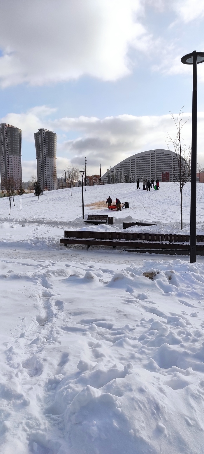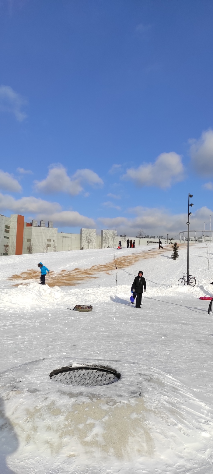 В парке Ходынское поле засыпают горки. Человек называющий себя директором парка прогоняет людей, грозит посадить родителя чей ребенок проехал рядом с ним. Основание: данные горки имеют декоративное значение и не предназначены для катания. В итоге был засыпан весь склон но я уже не фоткал, лапки замёрзли.