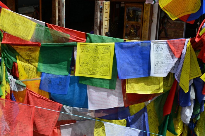 От верхушки ступы тянутся бесконечные веревочки с разноцветными тряпочками. Оказалось, что это молитвы, их вешают на ветреные места, чтобы ветер разносил энергию мантр по всему миру.