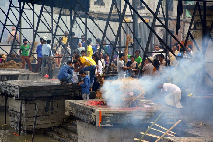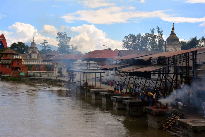 Далее в нашем списке был Храм Пашупатинатх. Он известен тем, что тут у реки расположены постаменты, на которых кремируют умерших, а прах впоследствии сбрасывают в реку, в которой люди стирают, моются и так далее. Мест для кремации несколько, и чем ближе место к основному храму, тем дороже здесь стоит кремация. Как ни странно ниже по реке люди стирают, моются и купаются. Дело в том, что это ещё один пример индуистского храма, где такие на первый взгляд противные вещи являются абсолютной нормой у местных. Зрелище и запах, скажу я Вам, специфические.