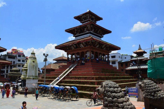 Бронируя, мы старались сэкономить, поэтому выбрали один из самых дешёвых вариантов, но это явно была ошибка) В отеле не было ни одного белого человека, только индусы и непальцы. Все стоило где-то десятку долларов, кондиционер еле работал, за окном была шумная пыльная стройка и т.д.)Мы очень проголодались и решили заказать еду в номер, и т.к. местные нас не поняли, они принесли нам 13 разнообразных блюд. Стола в номере не было, поэтому разложили все блюда прямо на кровати. Таким образом, атмосфера была следующая: мы сидели в одном из самых дешёвых отелей в одной из самой бедной стране мира и «обжирались» местными деликатесами) Но несмотря на это, мы в первый же день бодрым шагом пошли покорять достопримечательности столицы Непала. Начали естественно с площади Дурбар. Сейчас после землетрясения 2015 года эта площадь выглядит уже по-другому. Храм Маджу Девал был полностью разрушен.