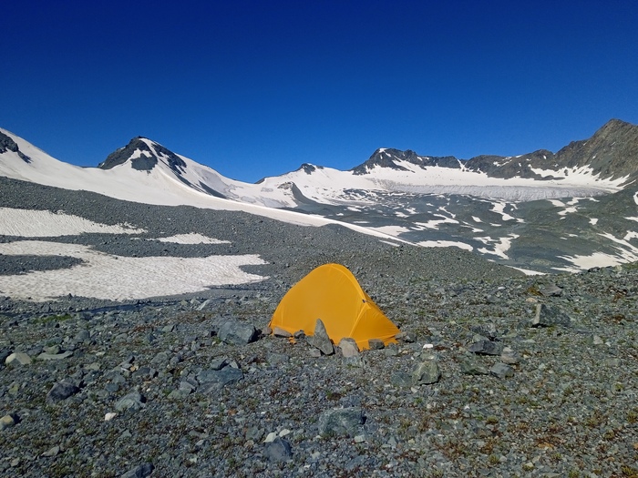 Стоянки есть на ближайшем к перевалу озере. Спускаться удобнее, опять-таки, с северной седловины. Причина, кажется, снова в леднике. Вот как он выглядит в августе 2020: